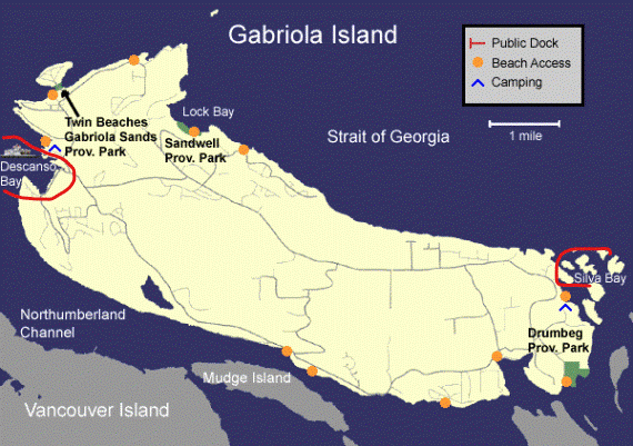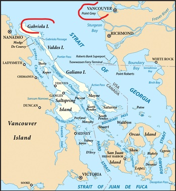 Quelques-unes des principales îles du détroit de Georgie. Gabriola est située au nord du détroit. On y accède en traversier (20 minutes de trajet) à partir de la ville de Nanaimo.