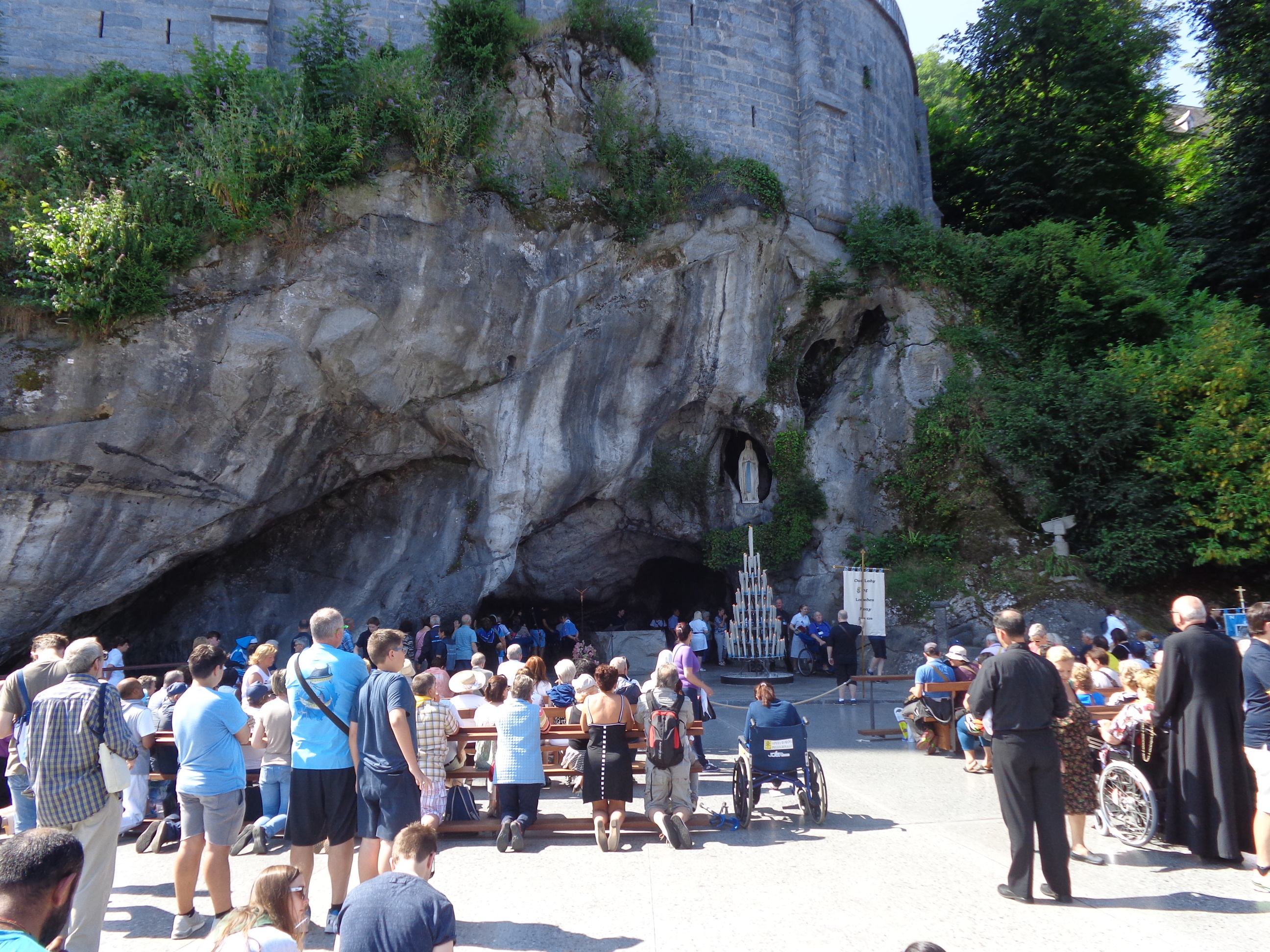 La Basilique de Lourdes. Ci-dessous, les nombreux pèlerins, certains handicapés, venus se recueillir devant la grotte de Massabielle, le mercredi 15 juillet.