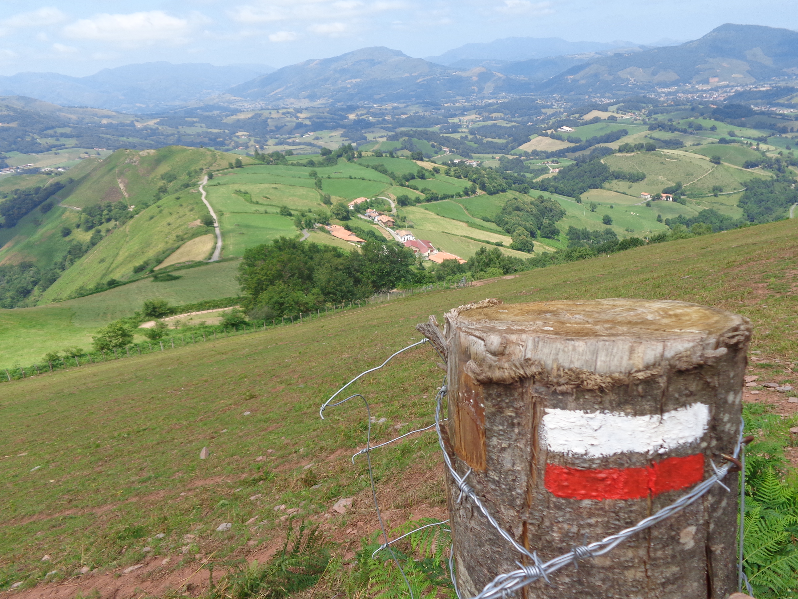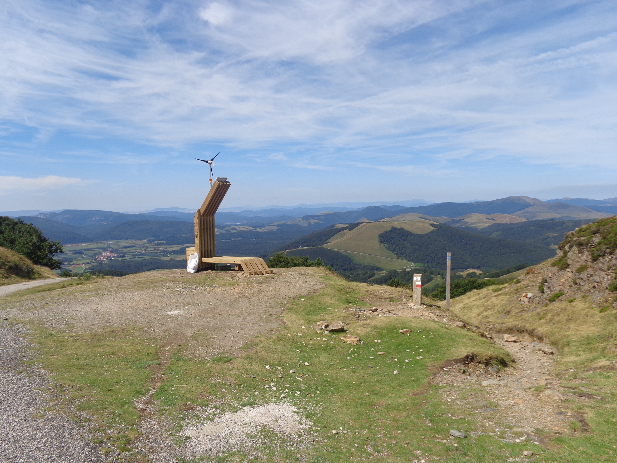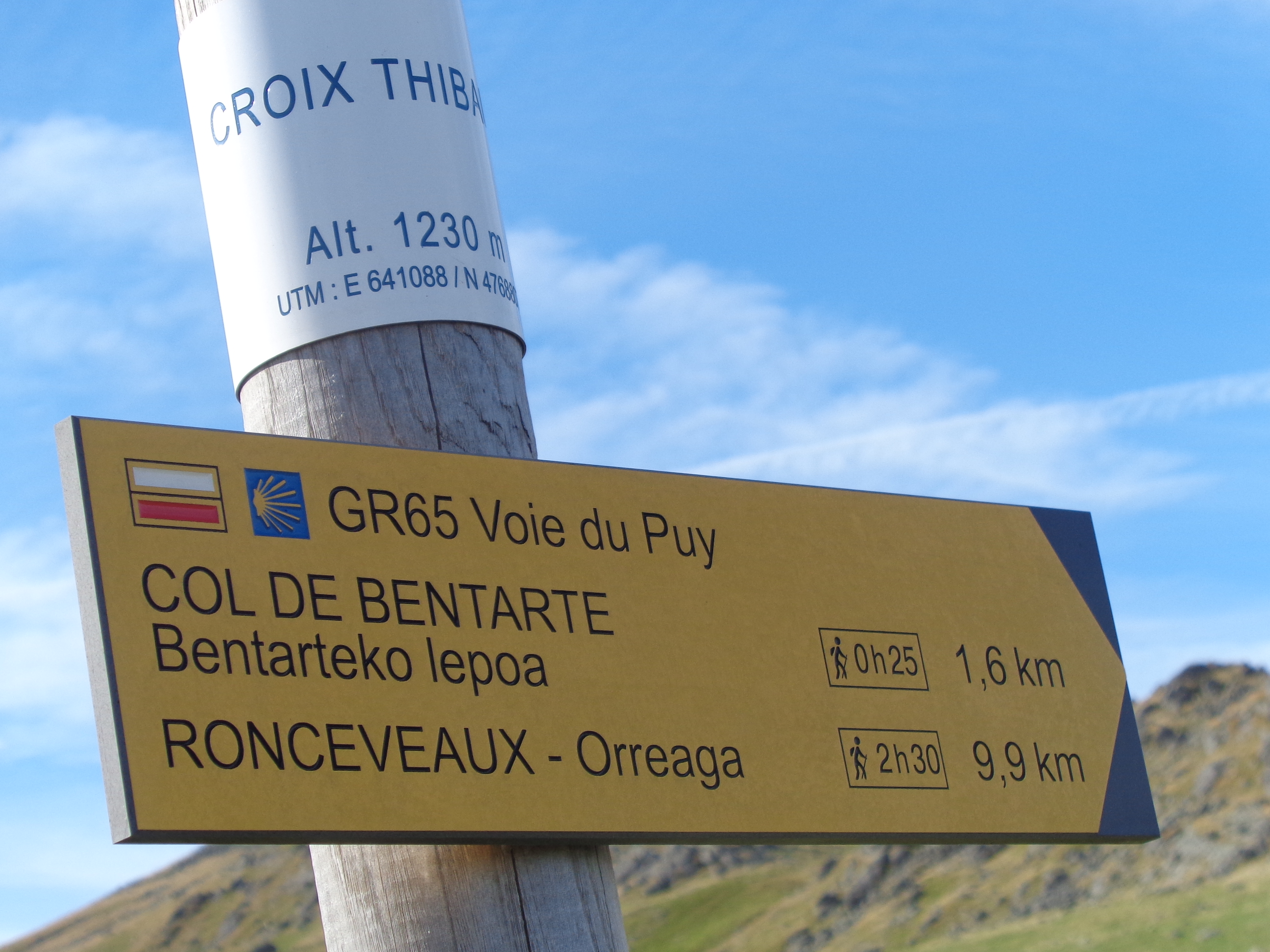 Sommet du col de Leopoeder (altitude 1410 mètres), point culminant du tronçon. On peut apercevoir Ronceveaux, à 5 kms, en bas de la vallée...