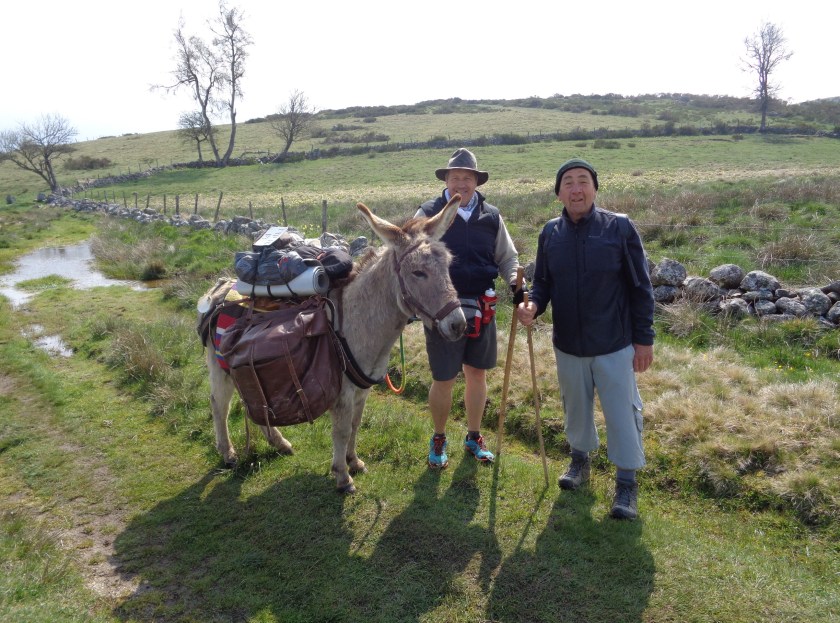 Pèlerins rencontrés dans l’Aubrac, le vendredi 4 mai, en route pour Conques, accompagnés de leur âne, Baladin…