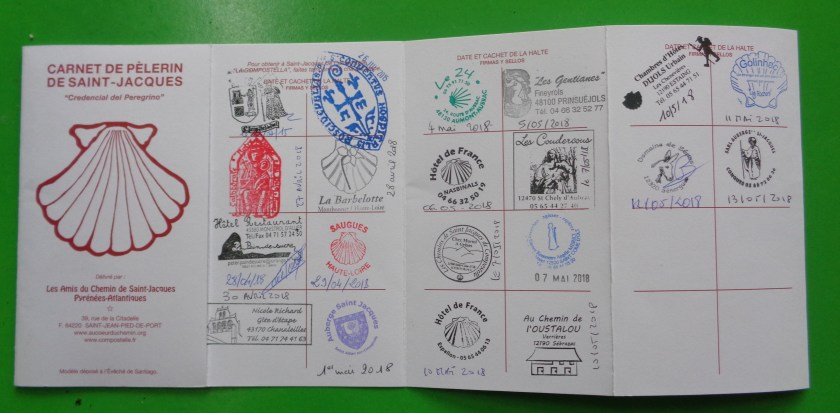 Mon carnet de pèlerin… obtenu en juillet 2015, au Pays basque, à Saint-Jean-Pied-de-Port... et dûment estampillé à chacune de mes étapes depuis Le-Puy-en-Velay…