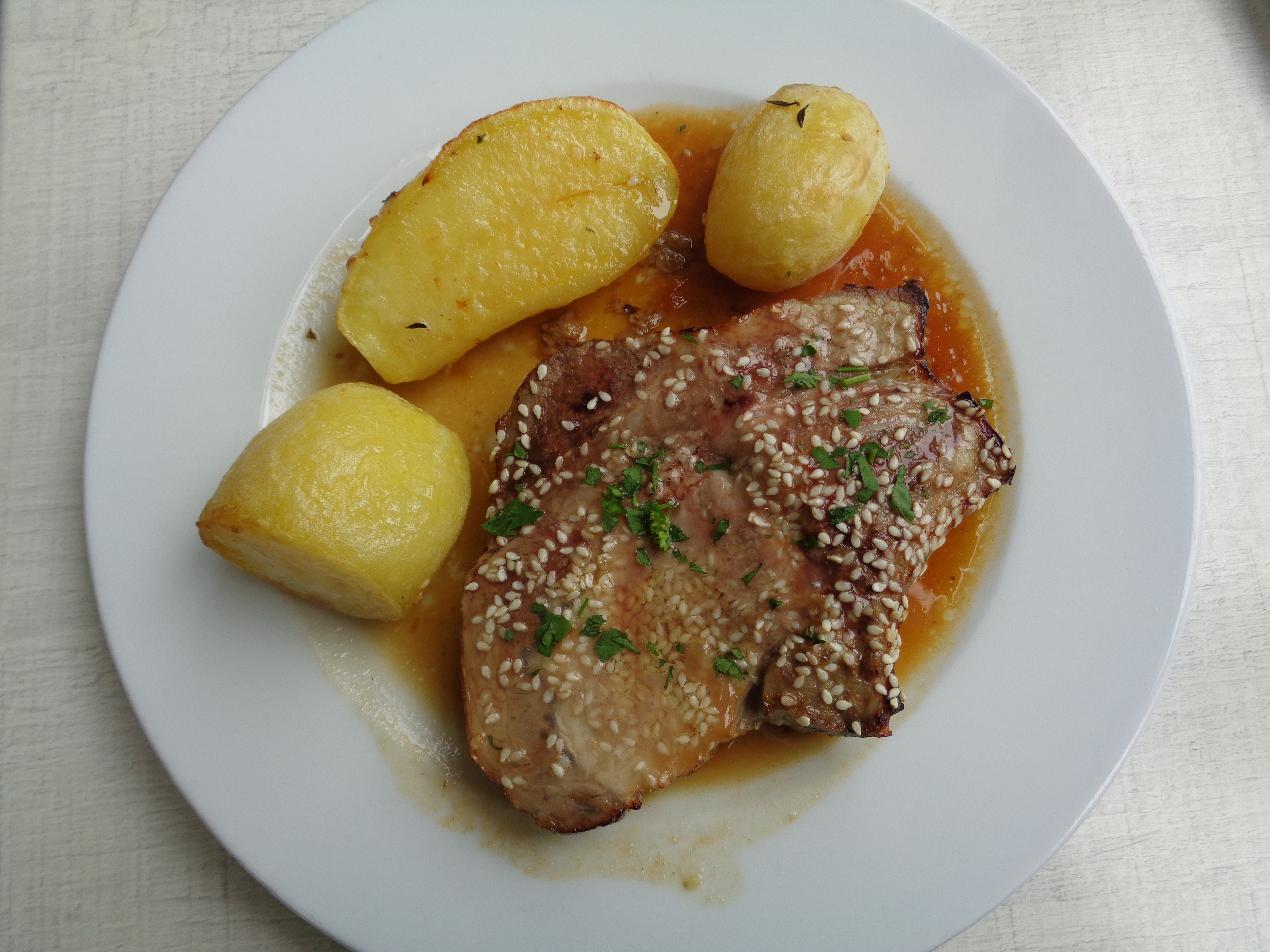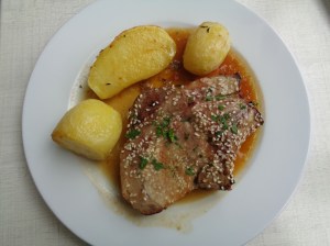Plat du jour à Espaillon, le mercredi 9 mai. Carré de porc pommes confites à la graisse d’oie….