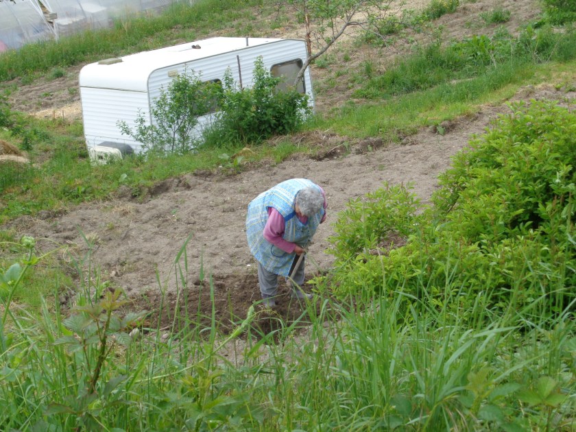 Femme âgée qui cultive seule, le samedi 12 mai, un lopin de terre près du village de Campagnac…
