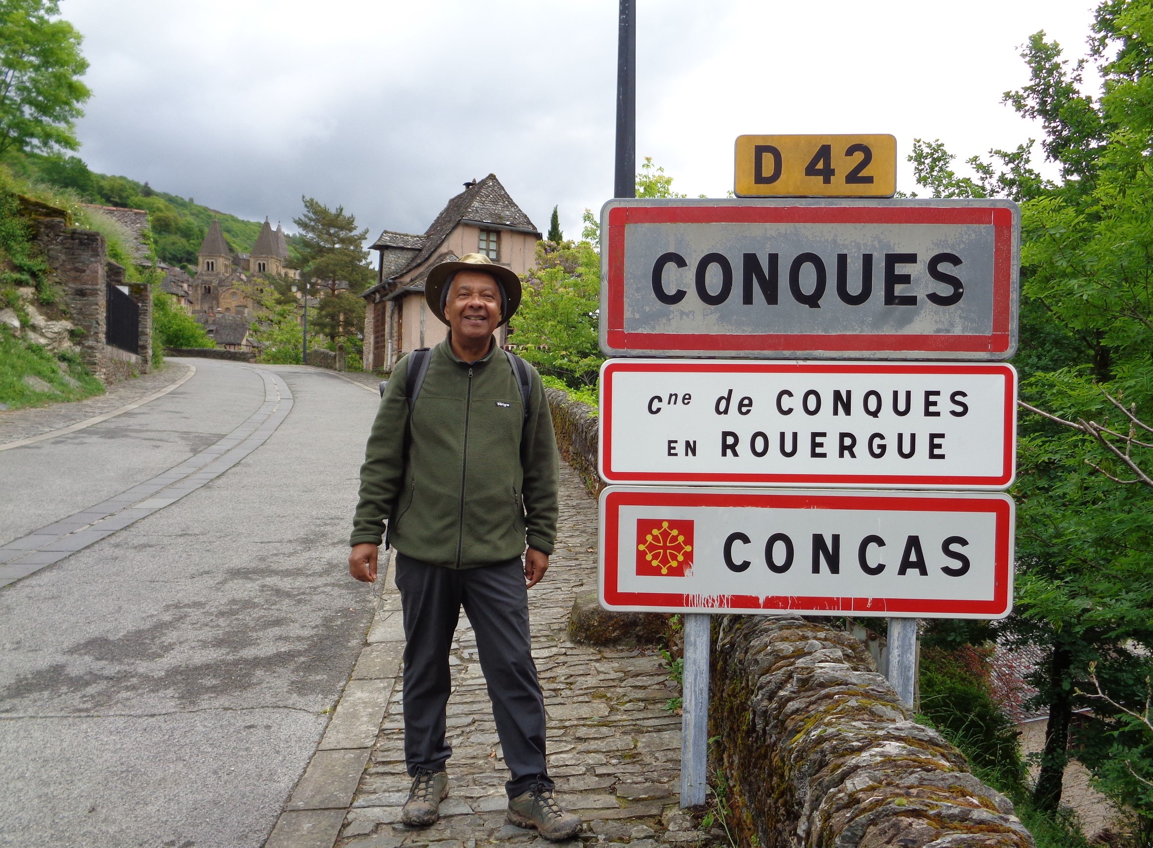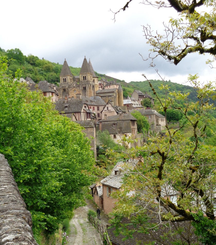 Arrivée à Conques (Concas en Occitan) sous les nuages et une pluie fine, le dimanche 13 mai… après 60 heures de marche sur le GR65 depuis Le-Puy-en-Velay!… Fatigué, les côtes meurtries après une lourde chute, les vêtements sales, les chaussures pleines de boue, une partie du pantalon déchiré (et recousu à Espalion)… mais… pari tenu!!