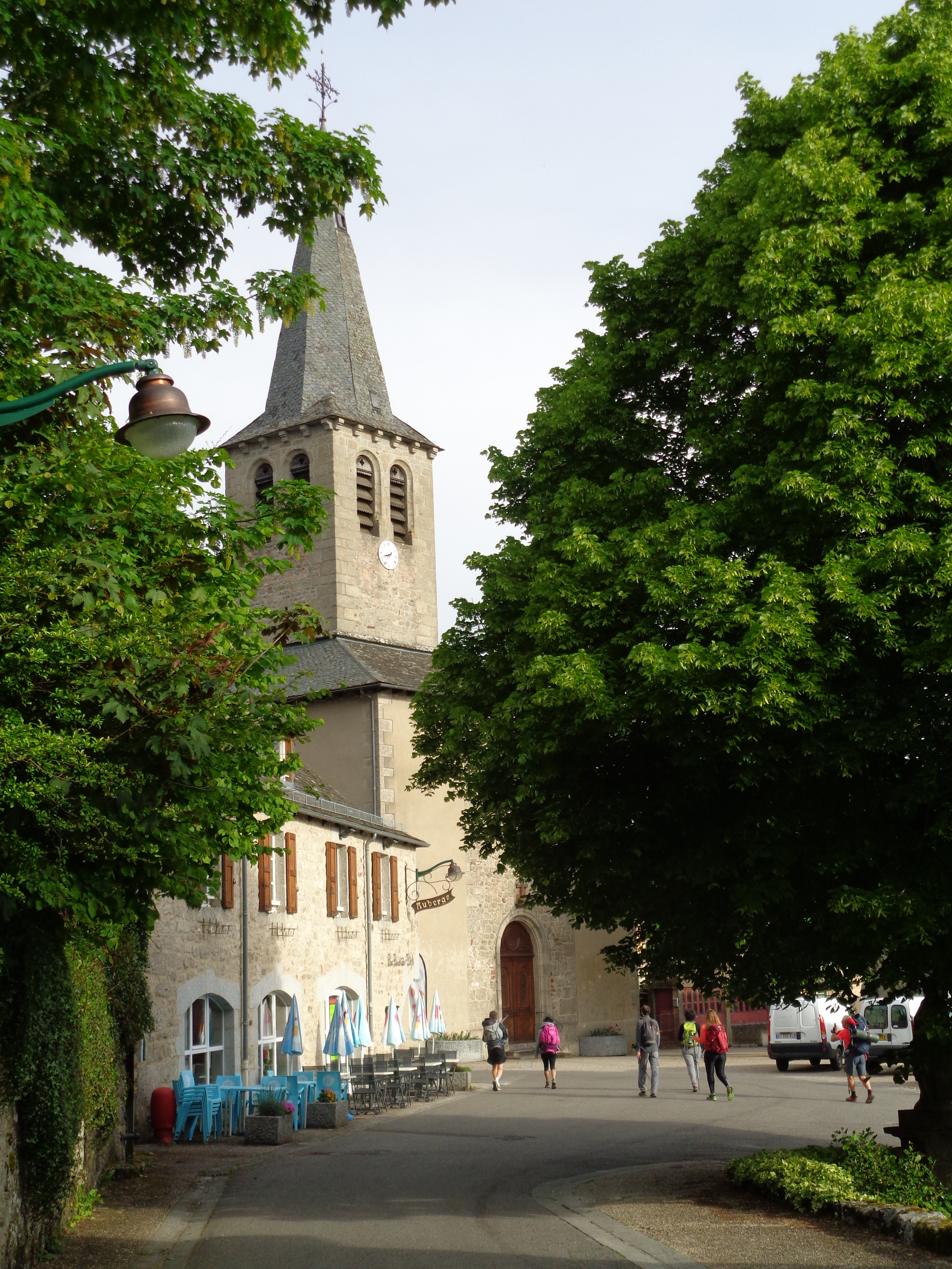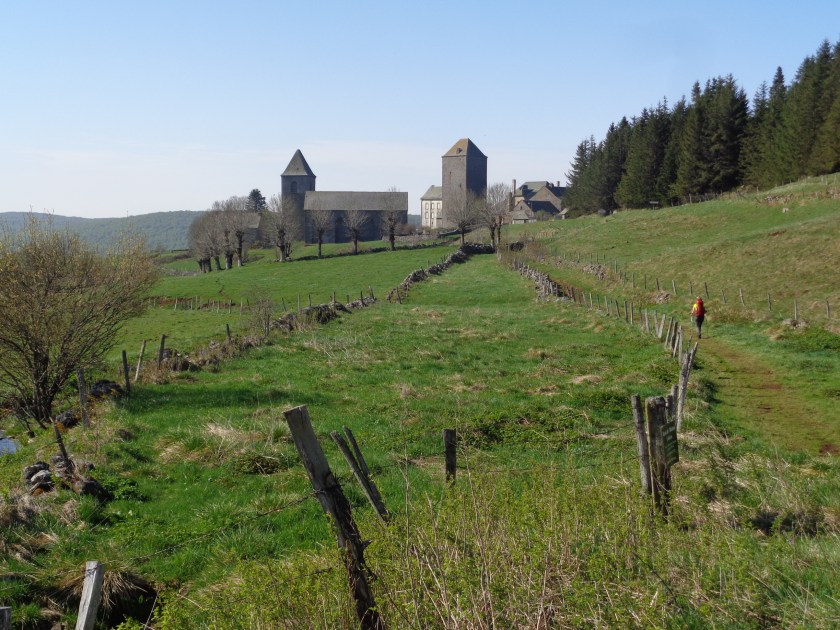 Arrivée au village d’Aubrac, le 6 mai, à mi-chemin entre Nasbinals et Saint-Chély d’Aubrac. À l’arrière-plan, la domerie d’Aubrac, le monastère qui marquait pour les pèlerins la fin des dangers… « Les soirs de brume », lit-on dans un ouvrage, « on y sonnait la cloche Maria, la cloche des perdus, afin que les égarés se dirigent vers le gîte plutôt que de mourir de froid... »