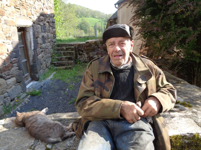 Vieil homme, accompagné de son chat, un peu perdu, rencontré dans les ruelles de Saint-Chély d’Aubrac, le dimanche 6 mai…