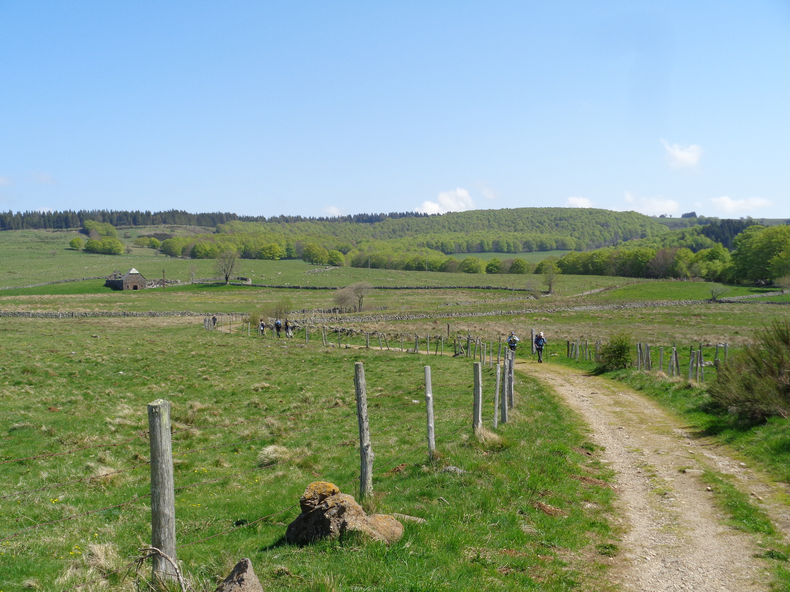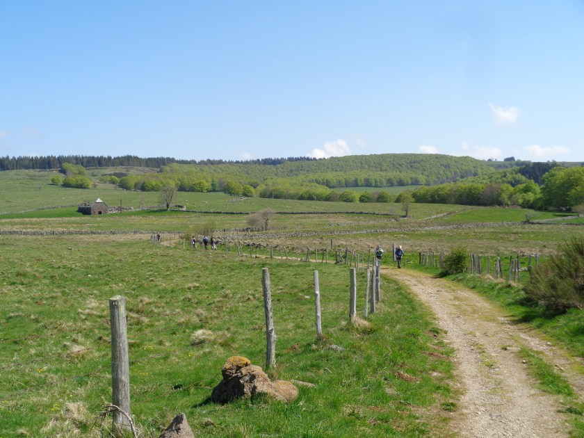 Traversée du plateau de l’Aubrac, le dimanche 6 mai. Ce tronçon de 17 kilomètres entre Nasbinals et Saint-Chély d’Aubrac a été classé en 1998 au patrimoine mondial de l’Unesco. Cette partie du chemin dans l’Aubrac était autrefois entièrement boisée – et dangereuse au Moyen-Âge pour les pèlerins qui se faisaient régulièrement dépouiller par les bandits cachés dans la forêt. Arriver le soir, sans être attaqué, était une chance. Les pèlerins devaient aussi se méfier des loups…