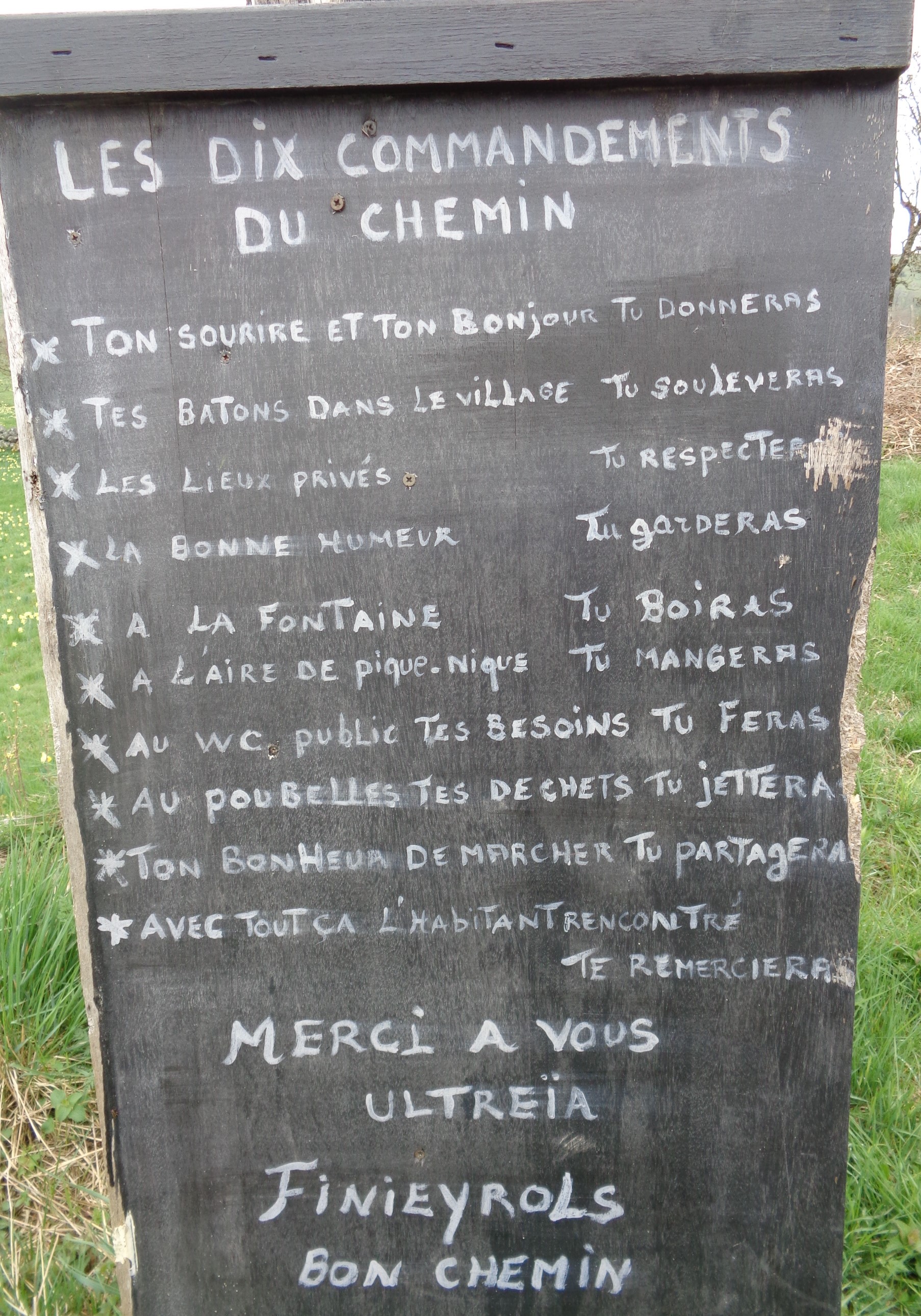 Les dix commandements du pèlerin modèle affichés sur le chemin entre Finieyrols et Nasbinals