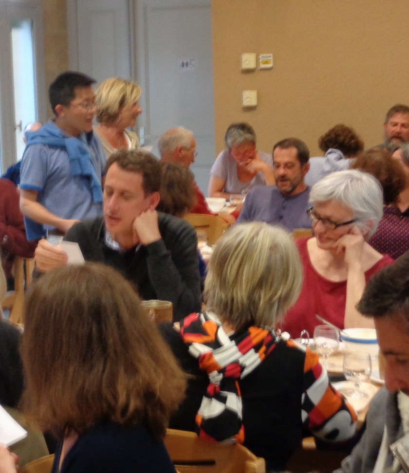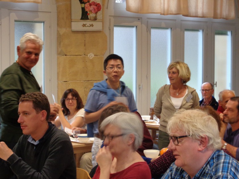 Randonneurs rassemblés ici dans la cafétéria du couvent autour d’un couple « d’hospitaliers » et d’un jeune séminariste vietnamien (né à Dalat!). Le trio enseigne au groupe, après le repas, une chanson traditionnelle de pèlerin..