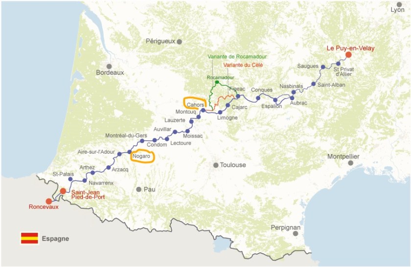Sur le chemin de Compostelle, encerclées en bleu, la ville de Cahors et la commune de Nogaro. Selon le mode du « saucissonnage » bien connu des pèlerins, j’effectuerai dans un an ou deux (avant ou après avoir rejoint les Pyrénées) le tronçon manquant du GR 65 entre Conques et Cahors.