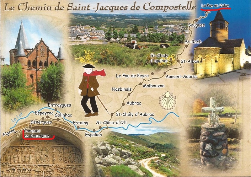 Carte postale du chemin parcouru le printemps dernier entre Le Puy-en-Velay et Conques. 207 kilomètres le long du (Chemin de Grande Randonnée) GR 65. Une expérience inoubliable!