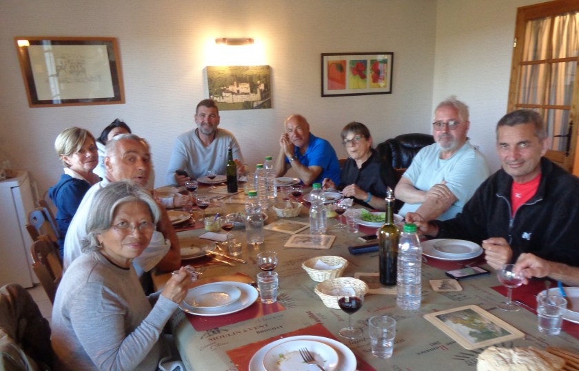 En ce début de saison, à la mi-mai, la plupart des pèlerins sont à la retraite ou en vacances. Au début de chaque repas, il y a souvent entre randonneurs, autour de la table, un lien de camaraderie assez fort. Même si nous ne nous connaissons pas, nous avons tous la veille ou pendant la journée marché sur le même sentier, traversé les mêmes villages, rencontré les mêmes riverains. Cela créée immédiatement entre nous une atmosphère amicale, bienveillante, intime, parfois propice aux confidences…