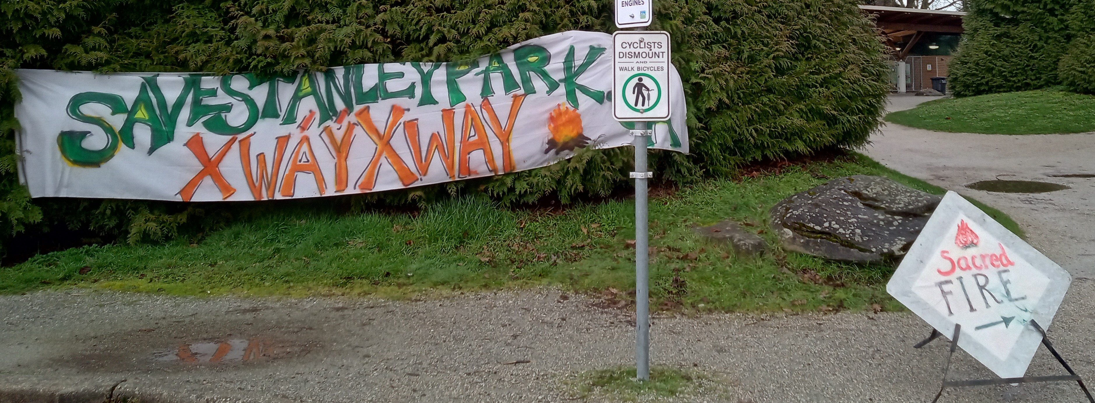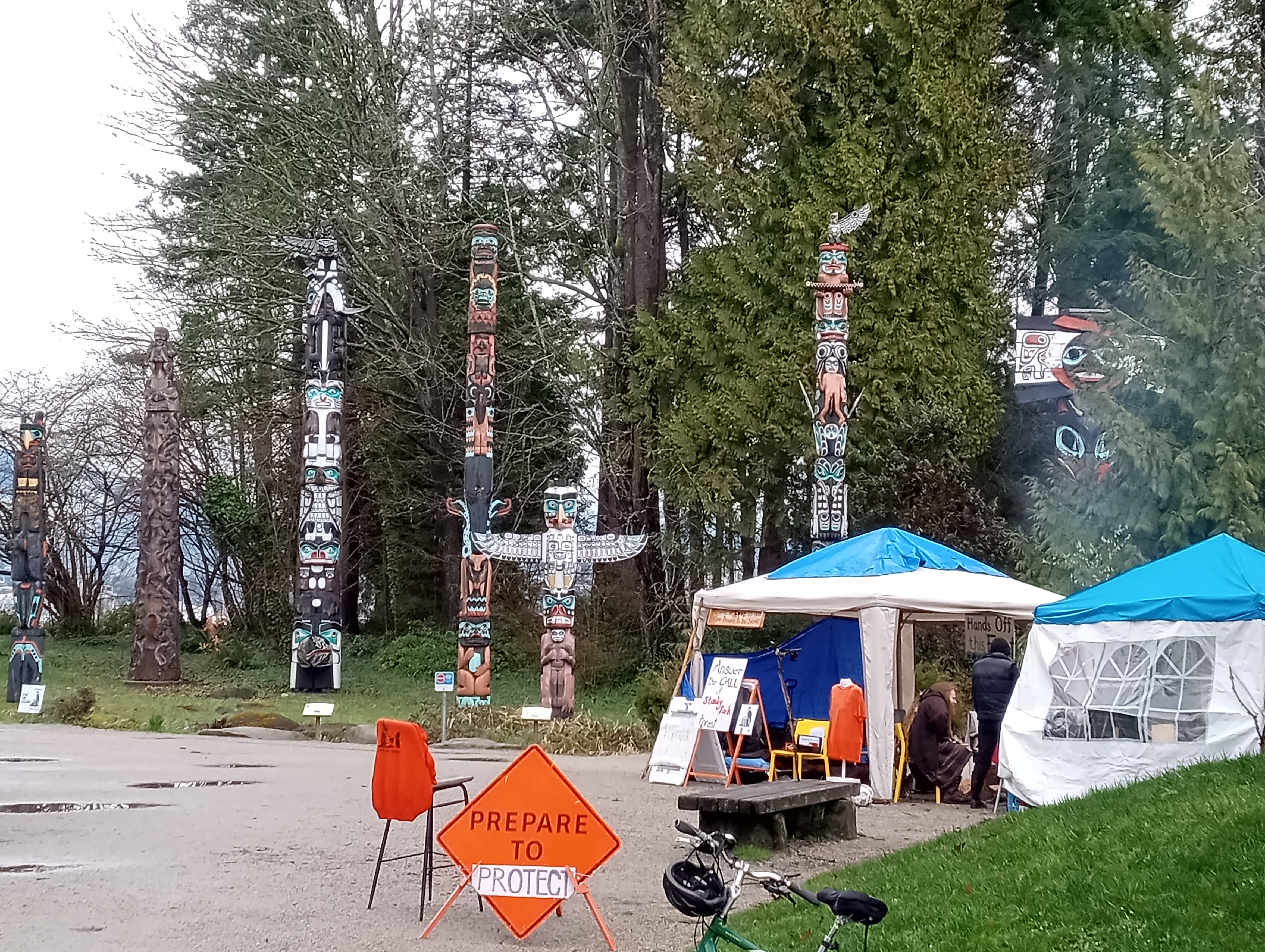 … un petit groupe d’activistes est réuni autour d’un « feu sacré » (sacred fire) pour dénoncer la coupe d’arbres au parc Stanley, coupe qu’il jugent excessive. Selon la Ville de Vancouver, plus de 100 000 arbres seraient touchés par un insecte qui se nourrit d’espèces de conifères côtiers. Brockton Point (Vancouver), le samedi 22 mars. Infos supplémentaires sur cet abattage controversé: ici