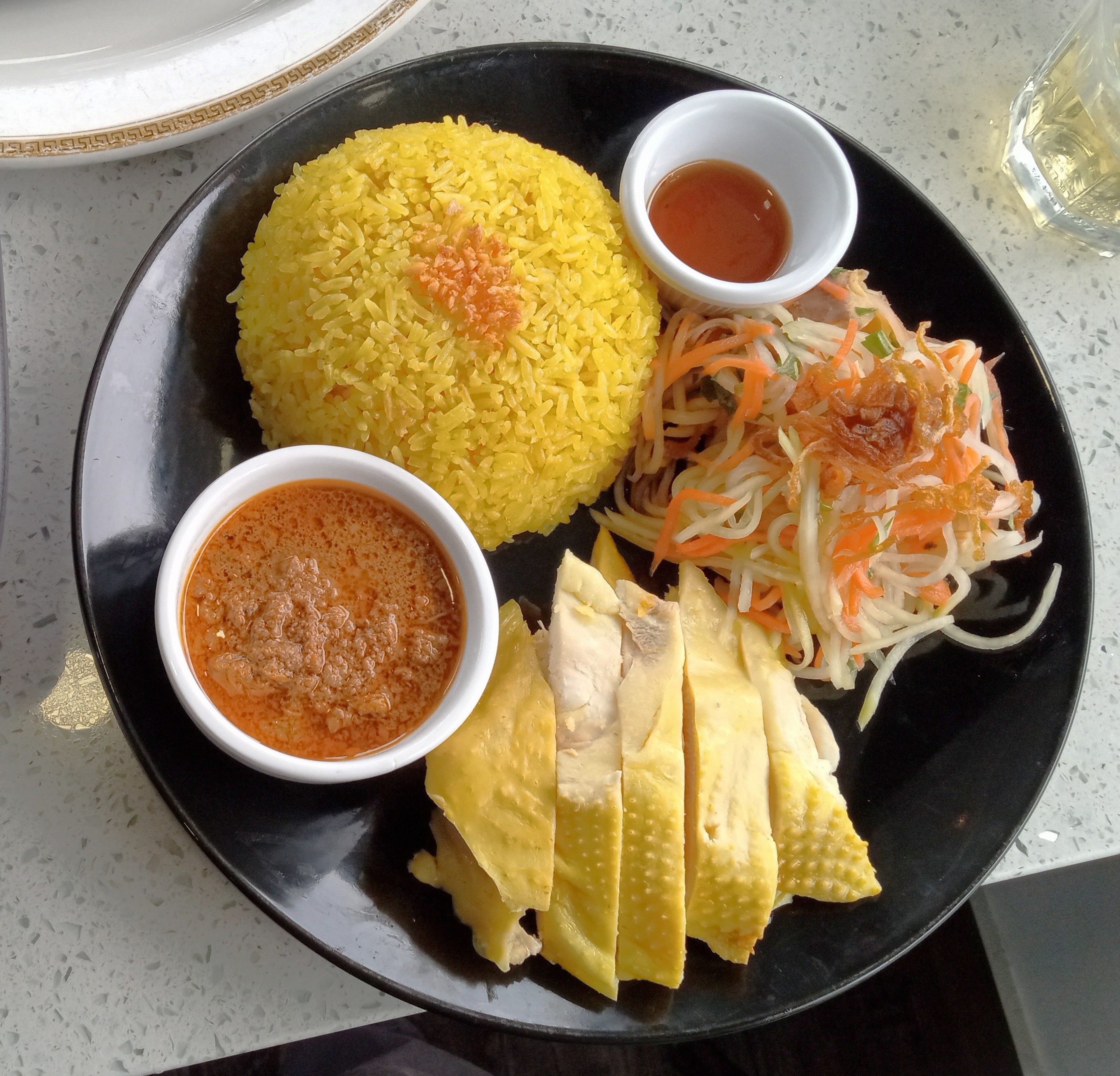 Poulet de Hainan accompagné de riz au safran, d’une salade et d’une sauce maison. Restaurant Dalat, Victoria Drive, Vancouver.