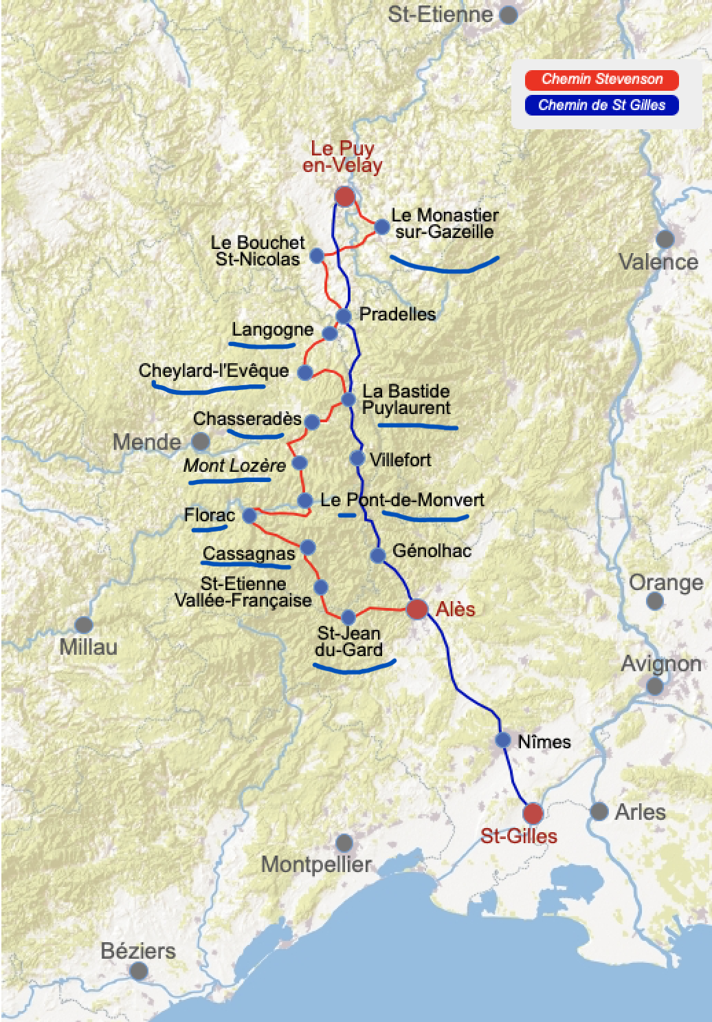 Entre le sud du Massif Central et les Cévennes, mes étapes sur le GR70 (tracé en rouge), baptisé « Chemin de Stevenson » en l’honneur de l’écrivain écossais qui, en 1878, a parcouru le sentier (avec son âne Modestine) avant de publier l’année suivante son célèbre récit  « Voyage avec un âne dans les Cévennes ». Je m’arrêtrerai aussi deux nuits à l’Abbaye Notre-Dame-des-Neiges (un peu avant La Bastide Puylaurent).