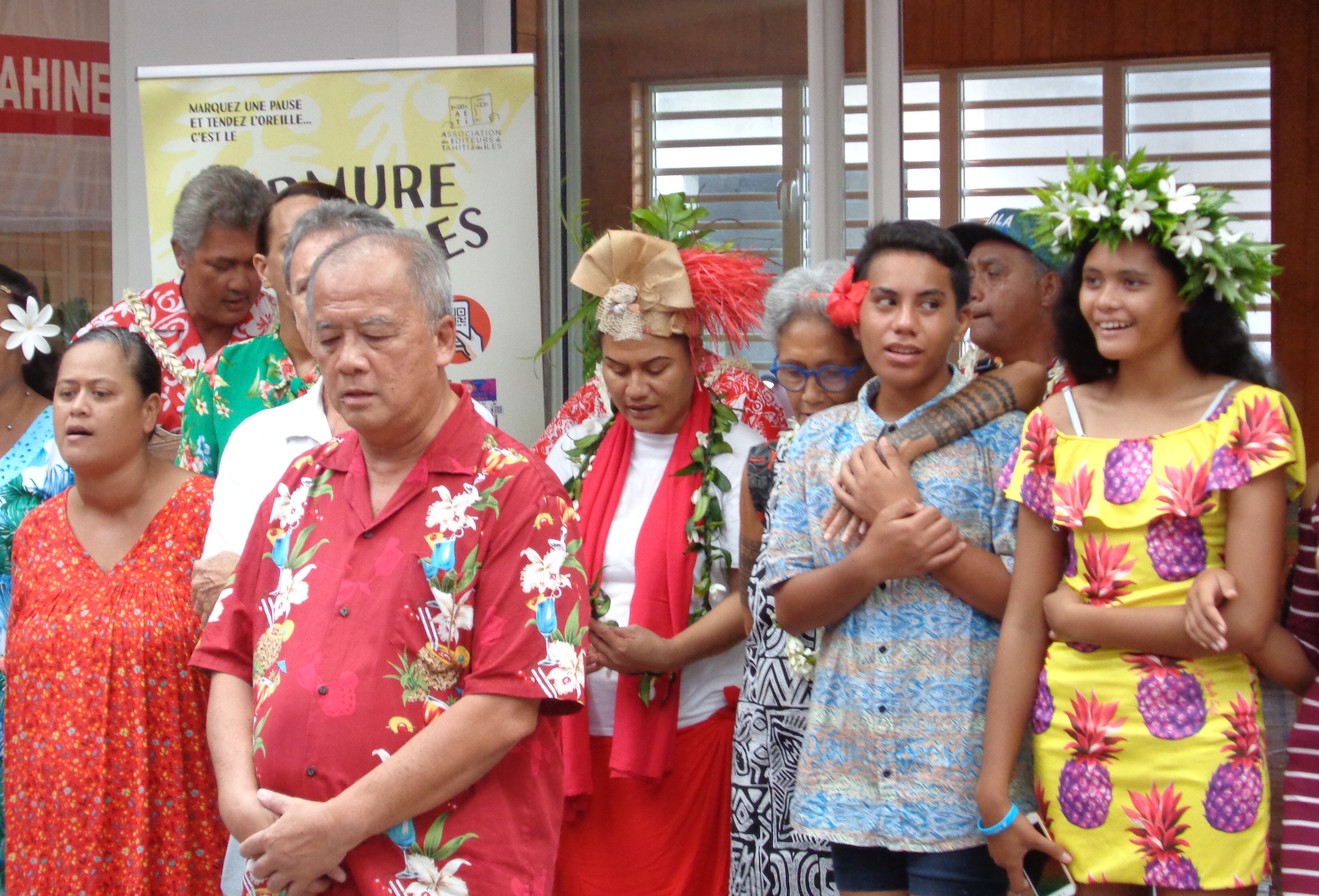 Chantal Sptiz (lunettes, cheveux blancs) lors d’une cérémonie au Salon du livre de Huahine,  en novembre 2022.