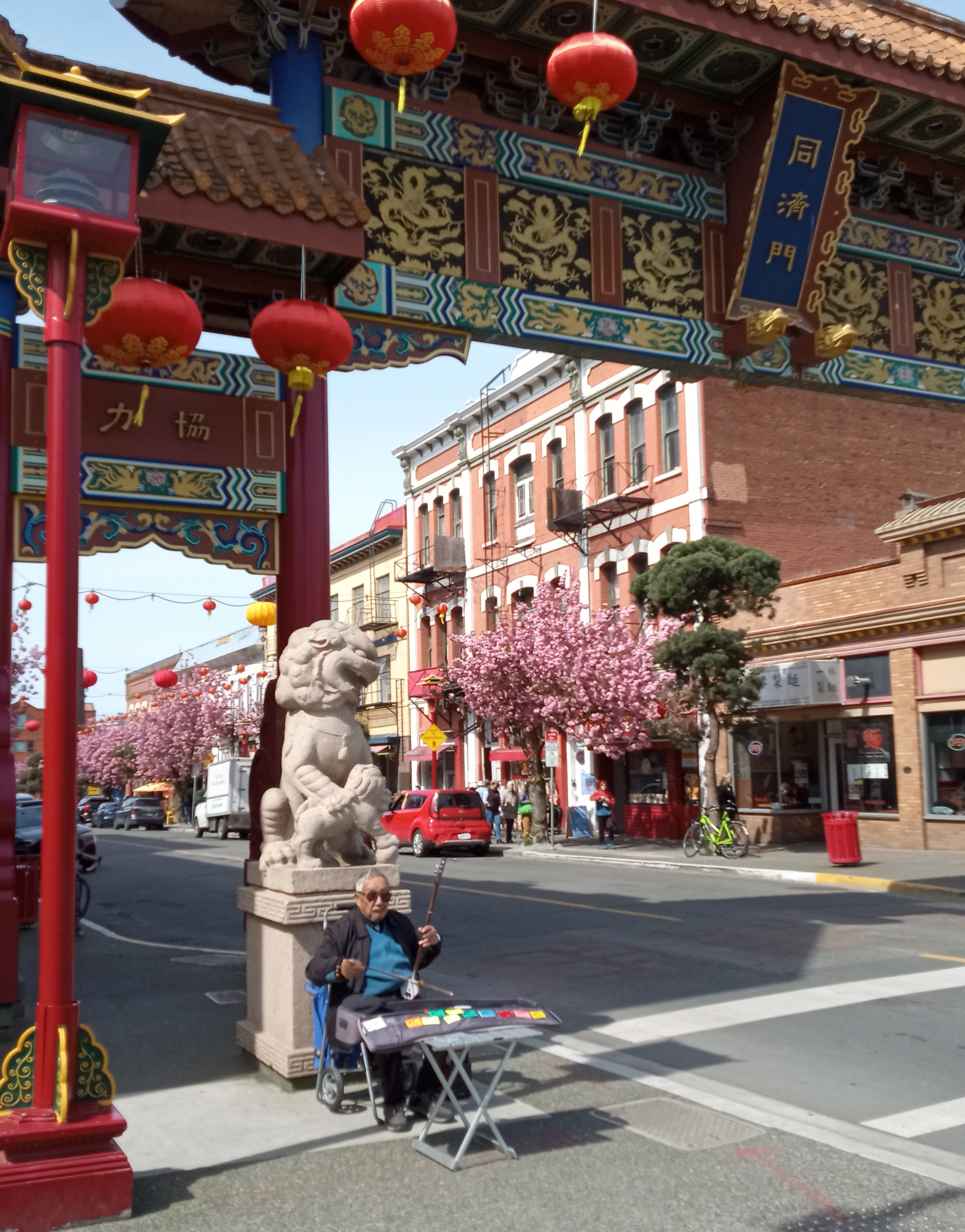 … jusqu’à Victoria, capitale de la province de la Colombie-Britannique où est situé le 2è plus ancien (1858) quartier chinois du continent, après celui de San Francisco. Plus de 3000 résidents d’origine chinoise vivaient ici autrefois. Ci-dessus, un musicien, à l’angle de Fisgard et Government St, perpétue le partage des mélodies traditionnelles. Victoria, le 14 avril.