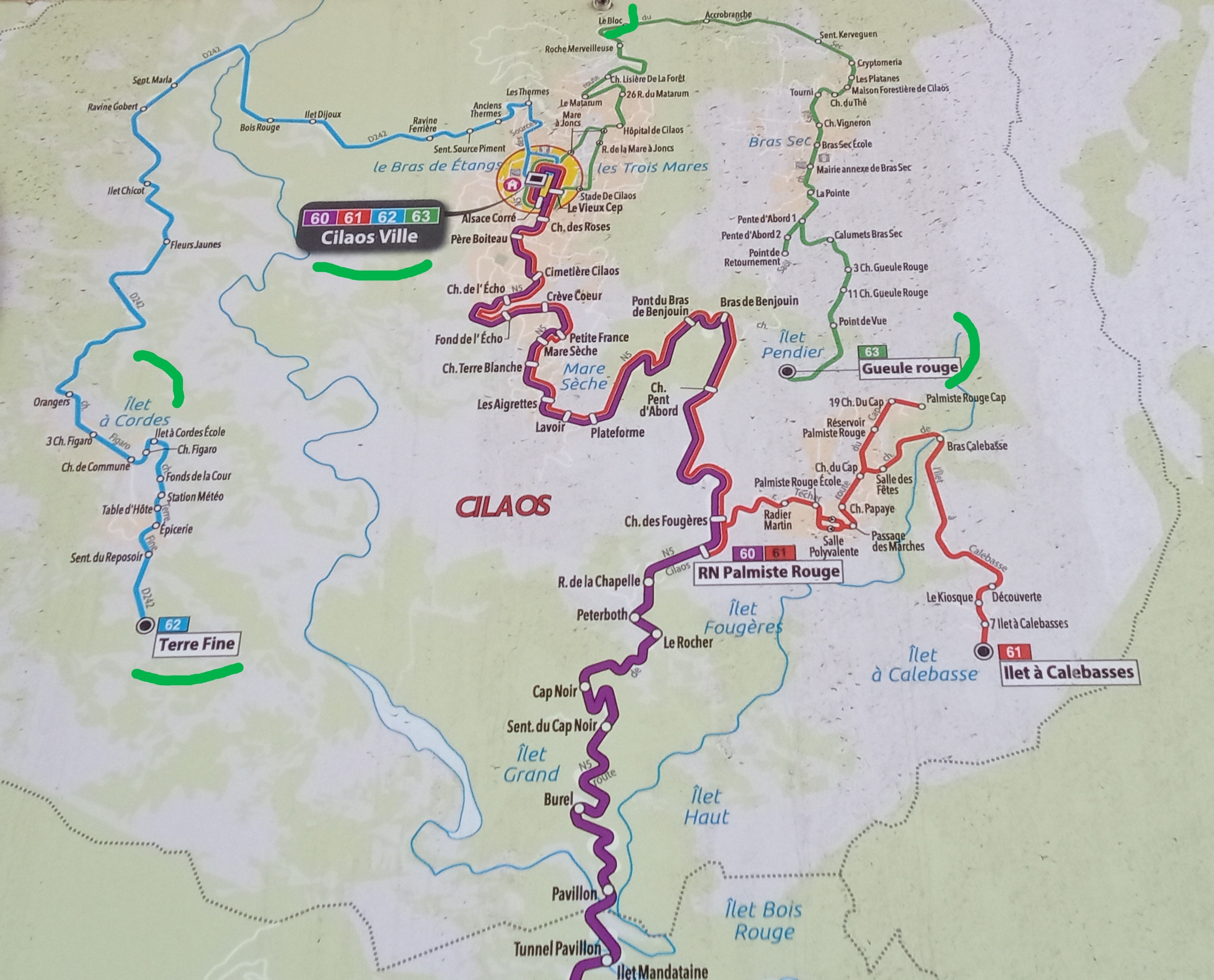 … grâce au pratique et ingénieux réseau de minibus qui relie les villages du cirque. Ci-dessus, en vert, quelques-unes de nos destinations: l’Ilet à Cordes, Terre Fine, Le Tronc, Bras-Sec, Gueule Rouge…