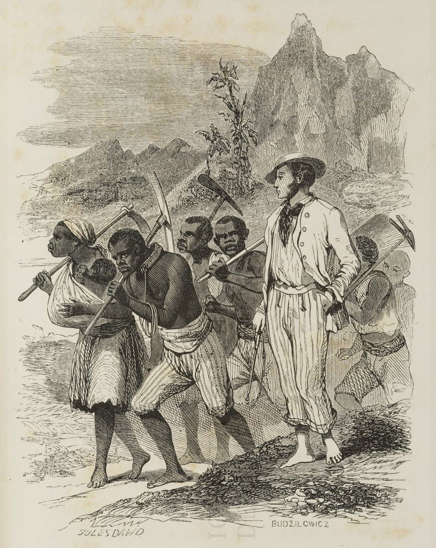 Esclaves se rendant au travail à Bourbon. (Gravure de 1850).