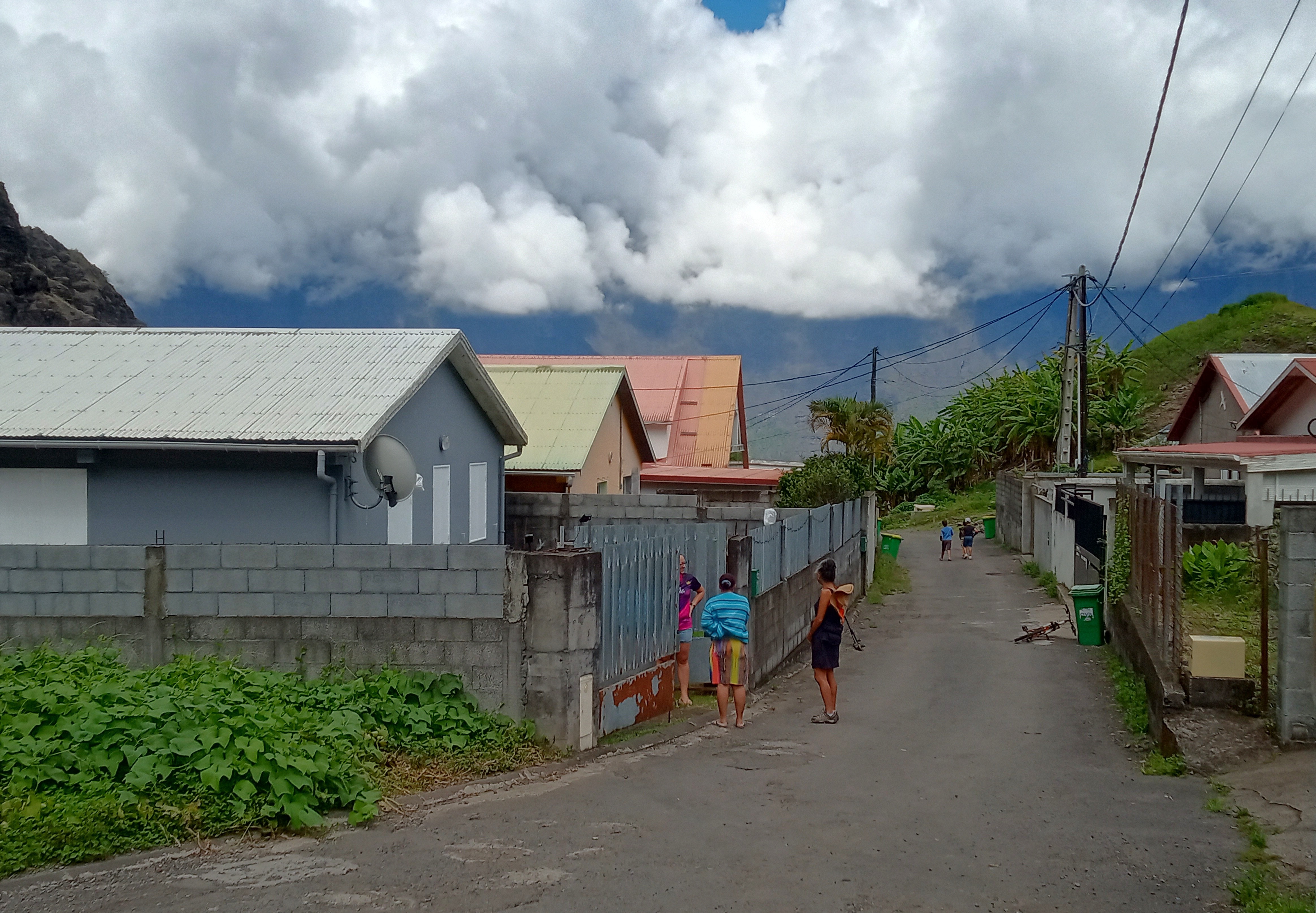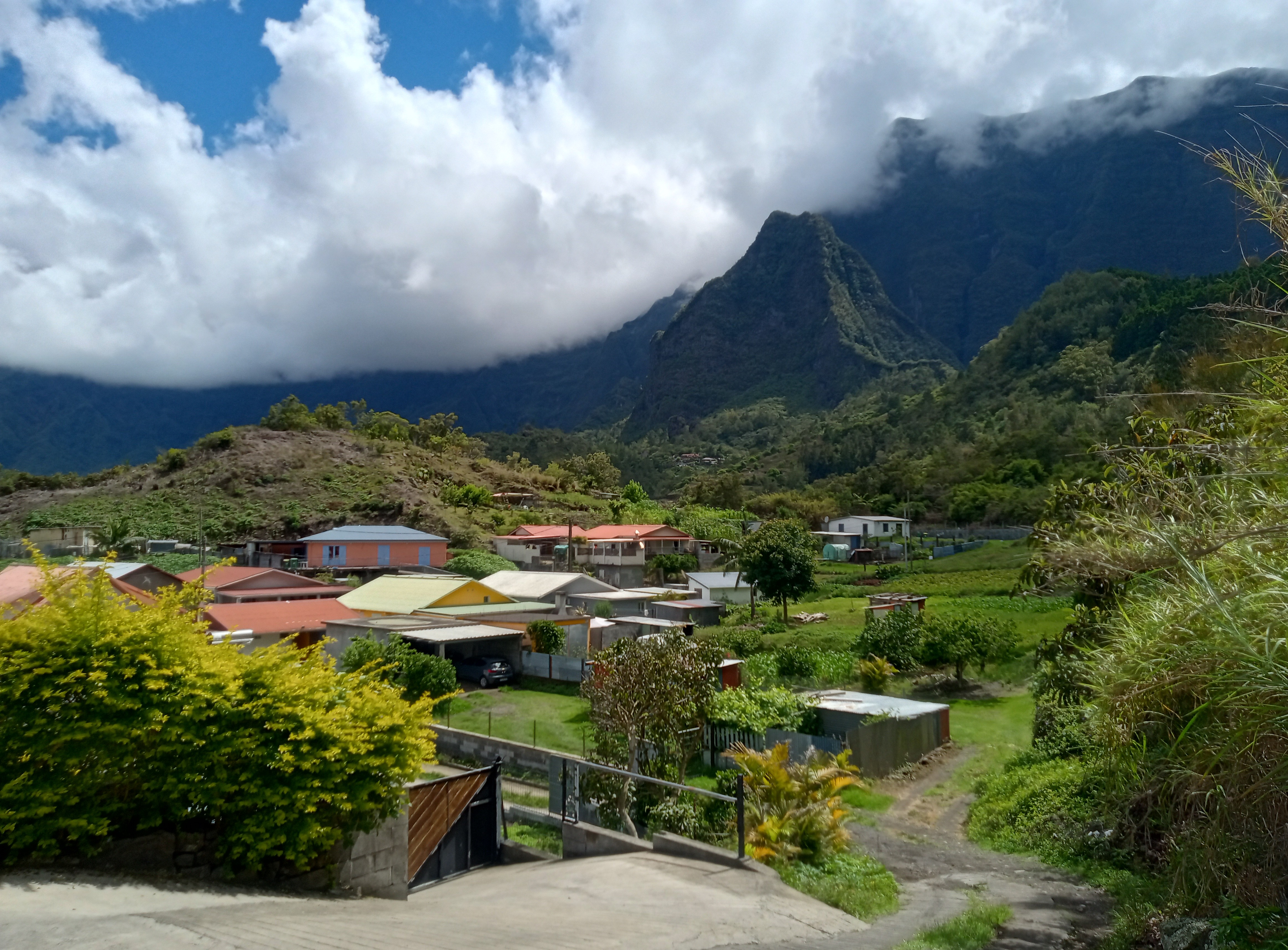 Arrivée le mardi 9 décembre sur le chemin « Terre Fine ». Paysage à couper le souffle. Sensation ici d’être au bout du monde. Nous sommes au coeur du cirque de Cilaos. À 6 kms environ au sud du village de l’Ilet à Cordes. La route ne va pas plus loin. À quelques mètres…