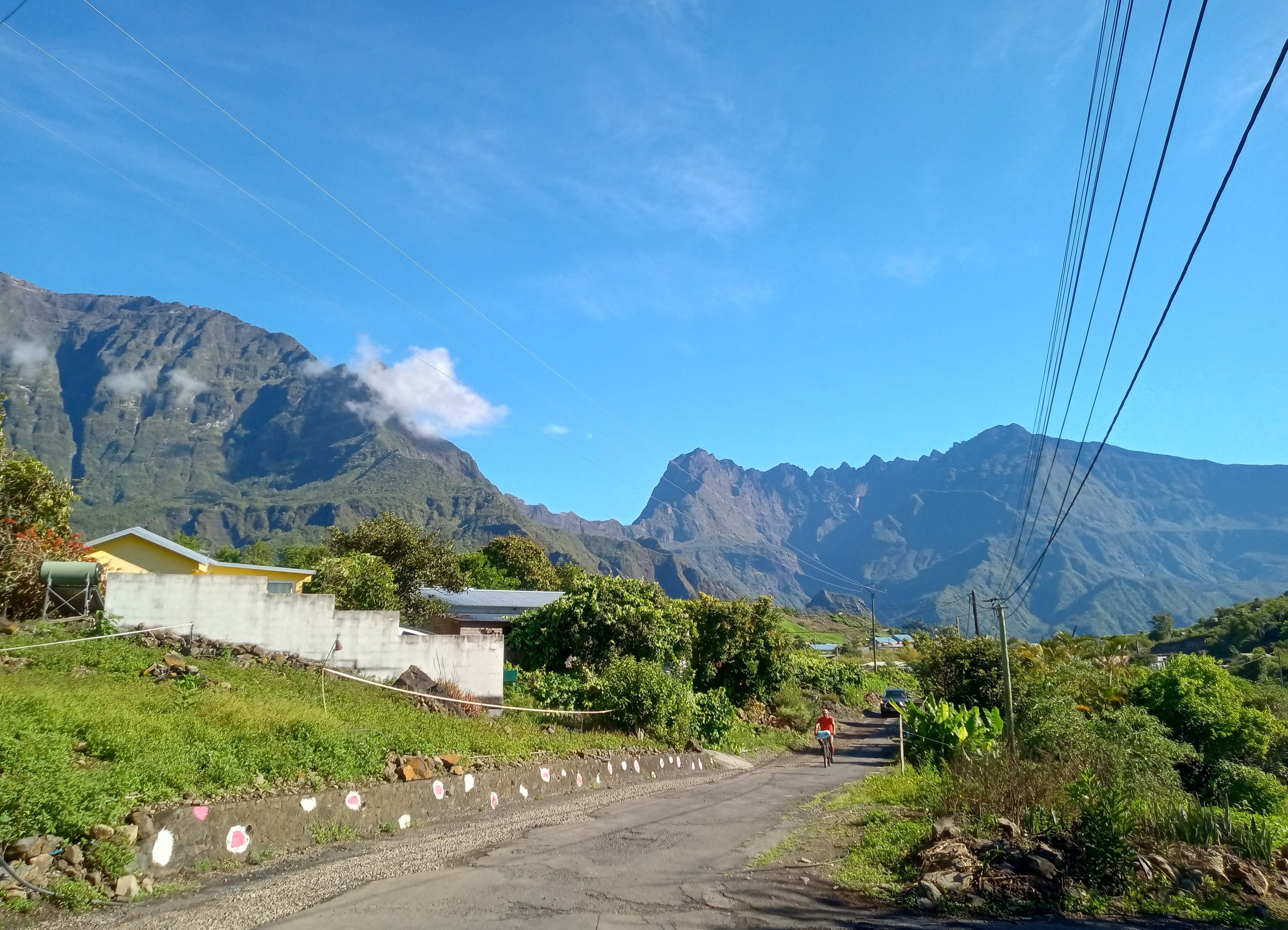 Diana à 6h du matin, sur le balcon de notre maison à Cilaos, le lendemain de notre arrivée, le samedi 6 décembre. À l’arrière-plan, le Piton des Neiges, le point culminant de La Réunion (3070 mètres) qui domine le « cirque » de Cilaos. Comme le montre la photo ci-dessous, un « cirque » est une vaste enceinte montagneuse (un peu comme une cuve) à parois très abruptes.