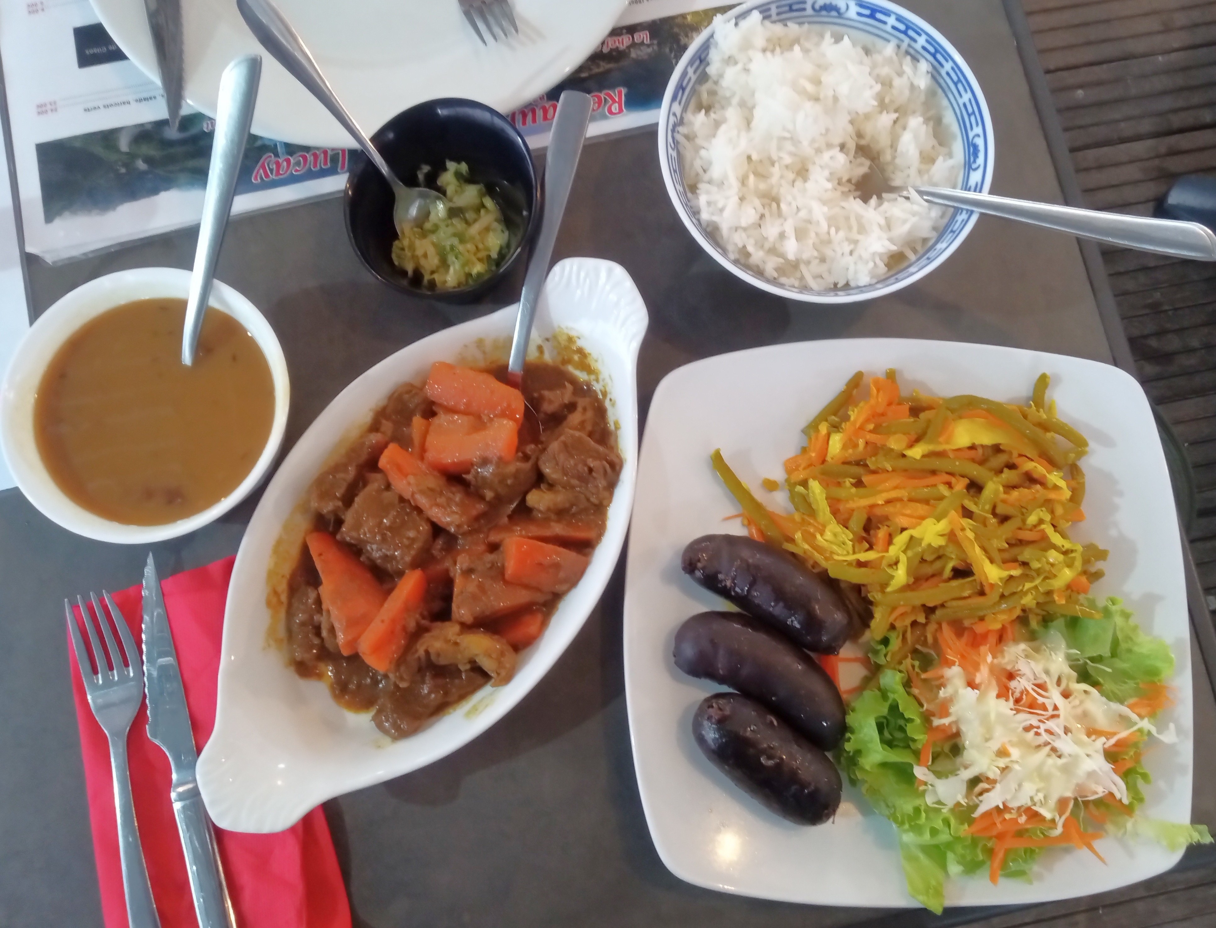 Boeuf carotte et boudin créole avec achards de légumes et riz aux pois + piments, Cilaos, le samedi 6 décembre.