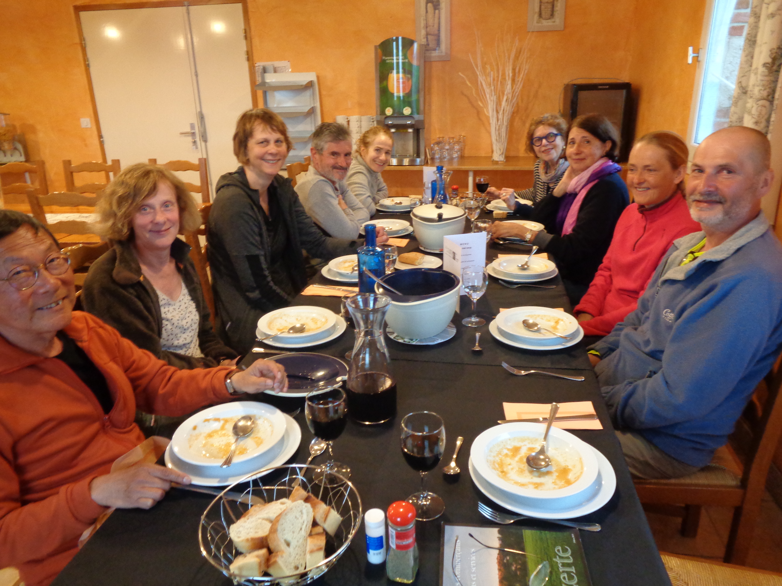 Belles rencontres et conversation à bâtons rompus le soir autour de la table des « Figuiers ». Des randonneurs de plusieurs pays – Allemagne, Slovénie, Vietnam, Belgique, France – partagent chaleureusement leur expérience et leurs souvenirs du Chemin… Certains l’ont déjà parcouru cinq ou six fois… Une très belle soirée…
