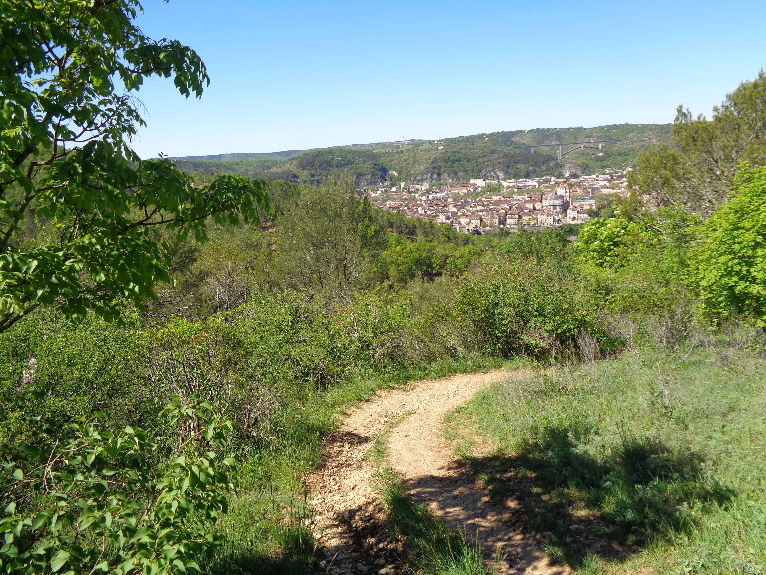 Quatre-vingt-dix minutes de randonnée environ dans un décor étonnant… À partir du pont Louis-Philippe, qui enjambe le Lot, le chemin du Mont St-Cyr grimpe lentement vers un immense plateau verdoyant…