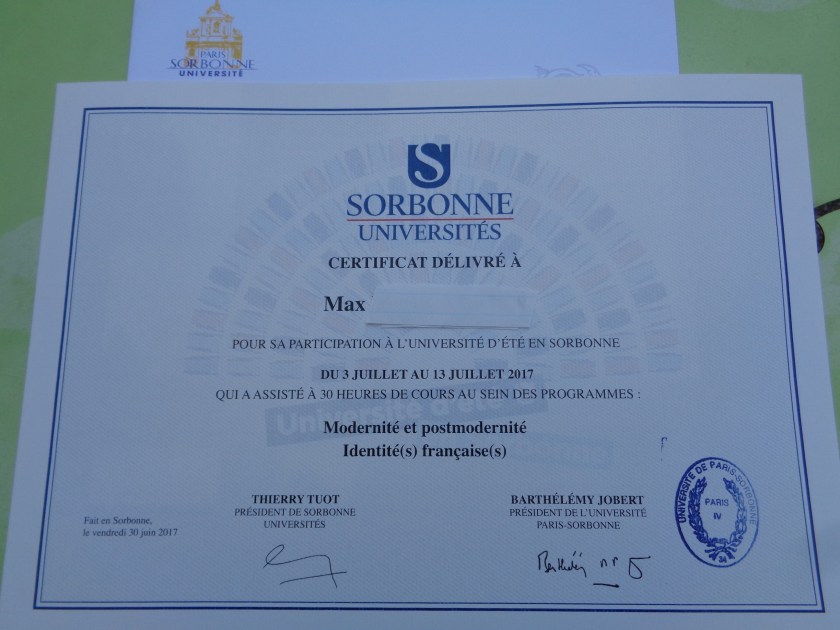 Diana m’a rejoint à Paris et je commence demain, rue Serpente, dans le Quartier latin, ma deuxième semaine de cours à la Sorbonne. Semaine consacrée aux « identités françaises ». Cela sera passionnant.